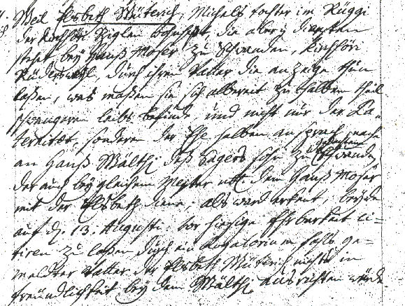 Elsbet Wüthrich was a maid of Hans Moser from Schwanden in the parish community of Rüderswil. On 30th June 1775 she complained Hans Wälti, saw miller’s son from Schwanden in the parish community of Rüderswil to be the father of her unborn child. 13 Juli1875: Hans Wälti was a farm hand of the same Hans Moser at the same time. On 13th July 1875 he accepted her paternity claim. He put, however, the condition that Elsbeth Wühtrich leaves her master immediately. Despite repeated requests of the church court of Trub and Hans Wälti she has not left Hans Moser. So on 1st October 1775 Hans Wälti announced that he doesn't want to marry Elsbeth Wührich any more. He suspected that Hans Moser is the father of the child. On 8th October 1775 Elsbeth has celebrated a suicide attempt. On 6th January 1776 the choir court of Trub could persuade Hans Wälti to marry Elsbeth Wüthrich. It also had forbidden to Hans Moser to do further interferences in this marriage, however. This verdict was confirmed by the upper church court of Berne on 28th January 1776.