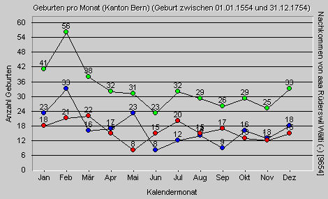 The table listed below contains the births of 395Wälti children listed in the parish registers of Rüderswil between 1554 and 1754. It shows that most of the children (14%) were born in February and that June was with barely 6% the weakest birth month.