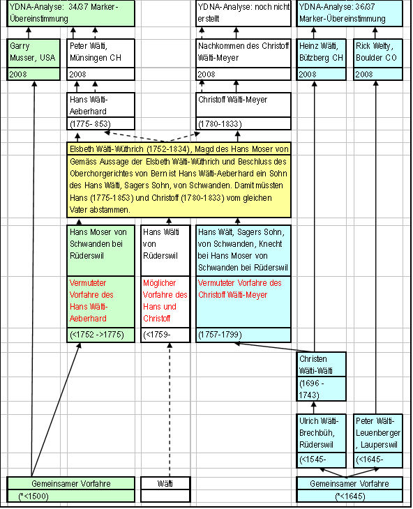 Hans Wälti-Aeberhard was - In accordance with statement of his mother, Elsbeth Wüthrich (1752-1834), and the verdict of the upper church court of Berne - a son of her husband Hans Wälti (1757-1799), saw miller’s son from Schwanden in the parish community of Rüderswil. An YDNA analysis seems, however, to prove that Hans Wälti-Aeberhard was a son of his mother’s master Hans Moser from Schwanden in the same parish community (see below). Christoff Wälti-Meyer (1780-1833) was, however, for certain a further son of Hans and Elsbeth Wälti-Wüthrich. An YDNA analysis of a descendant of this Christoff Wälti-Meyer would show, whether he was really a brother or only a half-brother of Hans Wälti-Aeberhard. Moreover, such a test is the perequisite for the further investigation of the ancestors of Hans Wälti-Aeberhard and Christoff Wälti-Meyer.